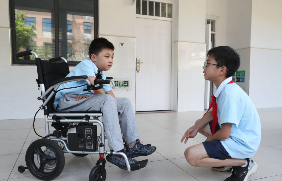 学习的时候,张一同学也绝不输给大家。课堂上,他积极举手。老师们给予他“免起立”的特殊特遇,他可以坐着回答问题。张一做好了作业,同学们就会争先恐后地当起“快递员”,把他的作业送给老师优先批改,改完再送回来。体育课,是张一比较喜欢的一门课。虽然他不能跟着同学们一起在运动场上奔跑,但他会“开”着轮椅看同学们上课,过过眼瘾。看到有趣的场面,他会在一旁哈哈大笑。遇到音乐、科学等需要到专用教室上的课时,张一同学也不想错过。班上的胡子迁、贺宇翔等几个男同学经常承担着抬张一上楼梯去上课的任务。