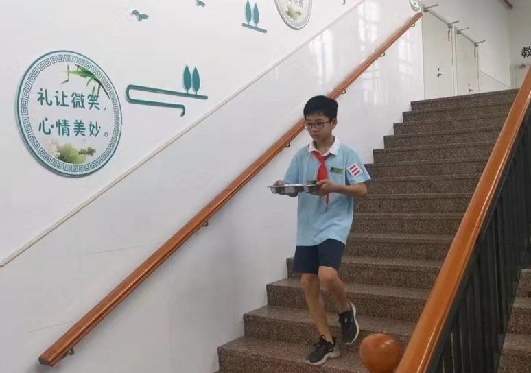午餐时间到了,通往食堂的路要过好几个台阶,还要上楼梯,这对于张一来说,实在不便,班上的张锦翰、盛彬涵等几个同学就轮流给张一送午餐,等他吃完后再把盘子送回食堂。后来,张群彦同学就独自承包了每天给张一送午餐一事。整整一学期,他天天都送餐。