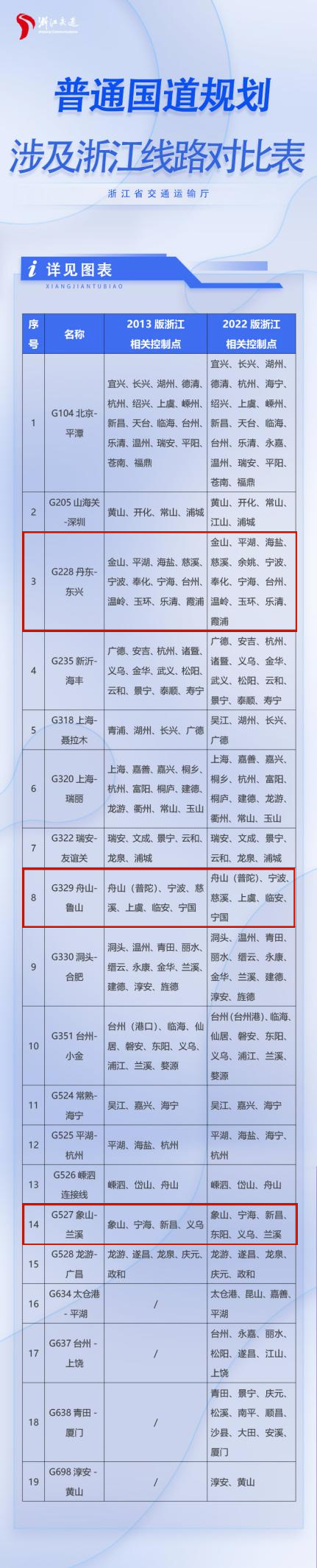 与2013版规划相比,本轮《规划》涉及浙江普通国道共计19条,新增4条,延长1条。