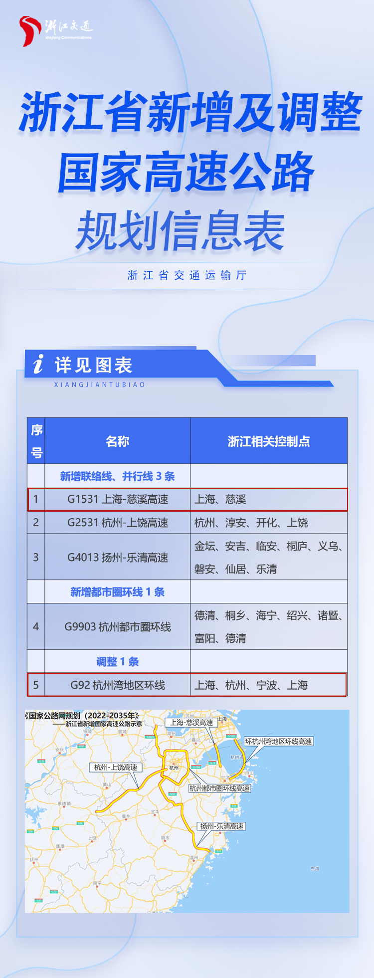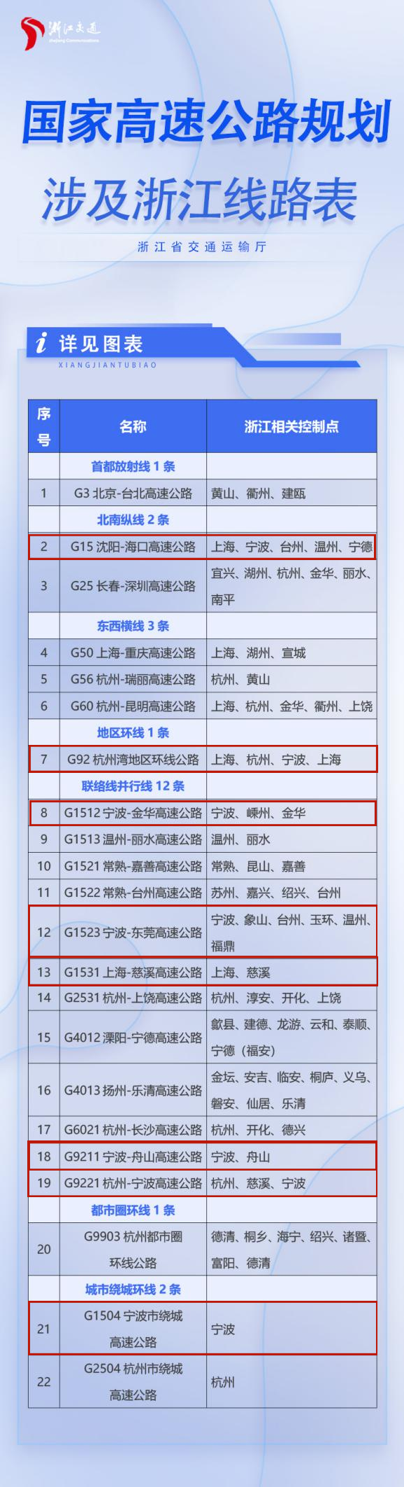 G1531上海-慈溪高速(规划沪甬通道)、G2531杭州-上饶高速、G4013扬州-乐清高速、G9903杭州都市圈环线。