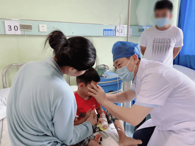 ▲手术前 潘伟华教授在病房为3龄童小患儿进行术前检查