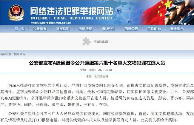 澎湃新闻记者注意到,上述《检察日报》报道提到的曹某华,即2021年公安部发布A级通缉令公开通缉十名重大文物犯罪在逃人员之一的曹钟华。通缉令显示,曹钟华,男,1984年12月8日出生,户籍地:安徽省宣城市宣州区狸桥镇南湖村沙溪组33号。