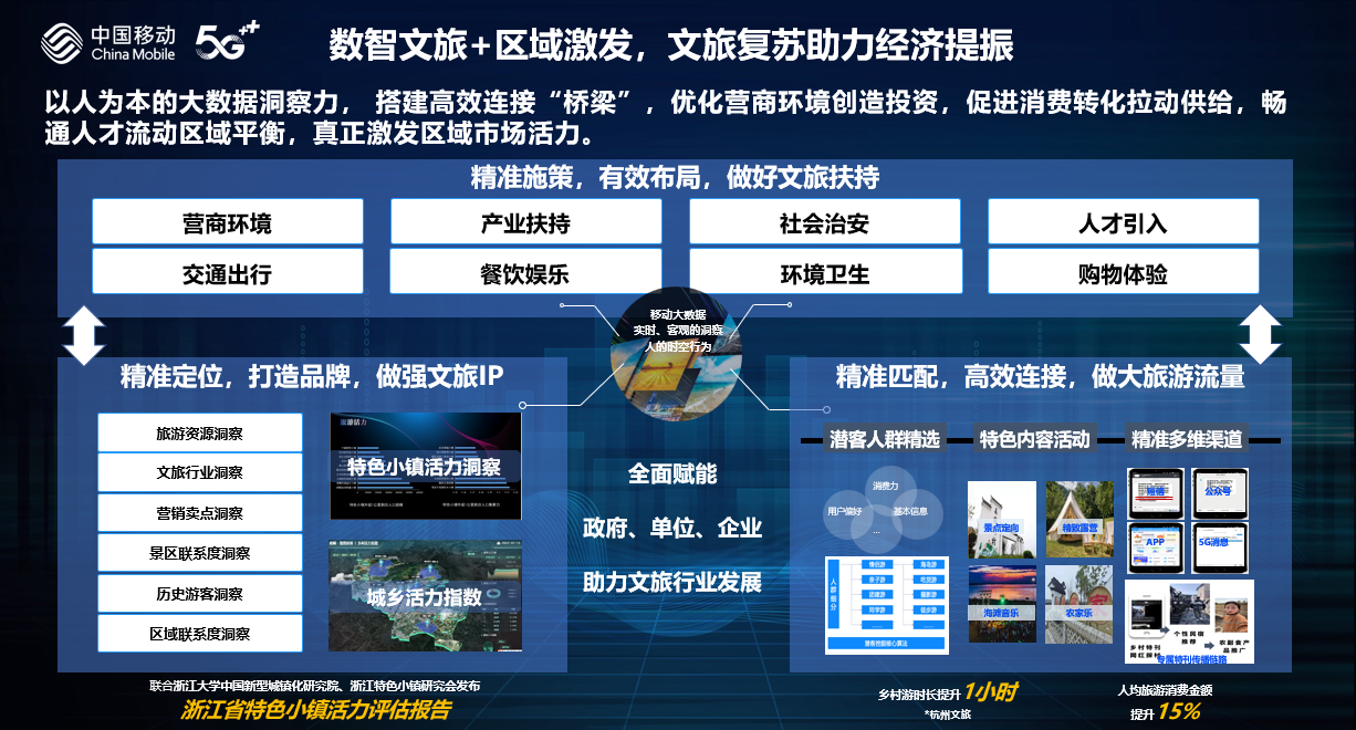 数智文旅+区域激发,促进文旅产业复苏,提振地方经济。宁波移动提供基于手机信令大数据的一体化旅游分析、自助统计报告、问卷调研等多样化诊断能力,解决旅游数据统计难、统计标准模糊等问题,辅助各区域发现文旅发展的优势与薄弱环节,助力区域文旅锚定发展方向、优化旅游资源和配套政策。同时基于梧桐大数据平台的拓客营销能力与配套激发工具,可以科学分析客源市场,有针对性地开展市场营销,拉动旅游消费,提振地方经济。
