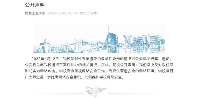 西北工业大学公开声明:“我们坚决反对以任何形式实施网络攻击。学校高度重视网络安全工作,为师生营造安全的网络环境。学校号召广大师生进一步提高网络安全意识,共同维护学校网络安全。”(中新财经)