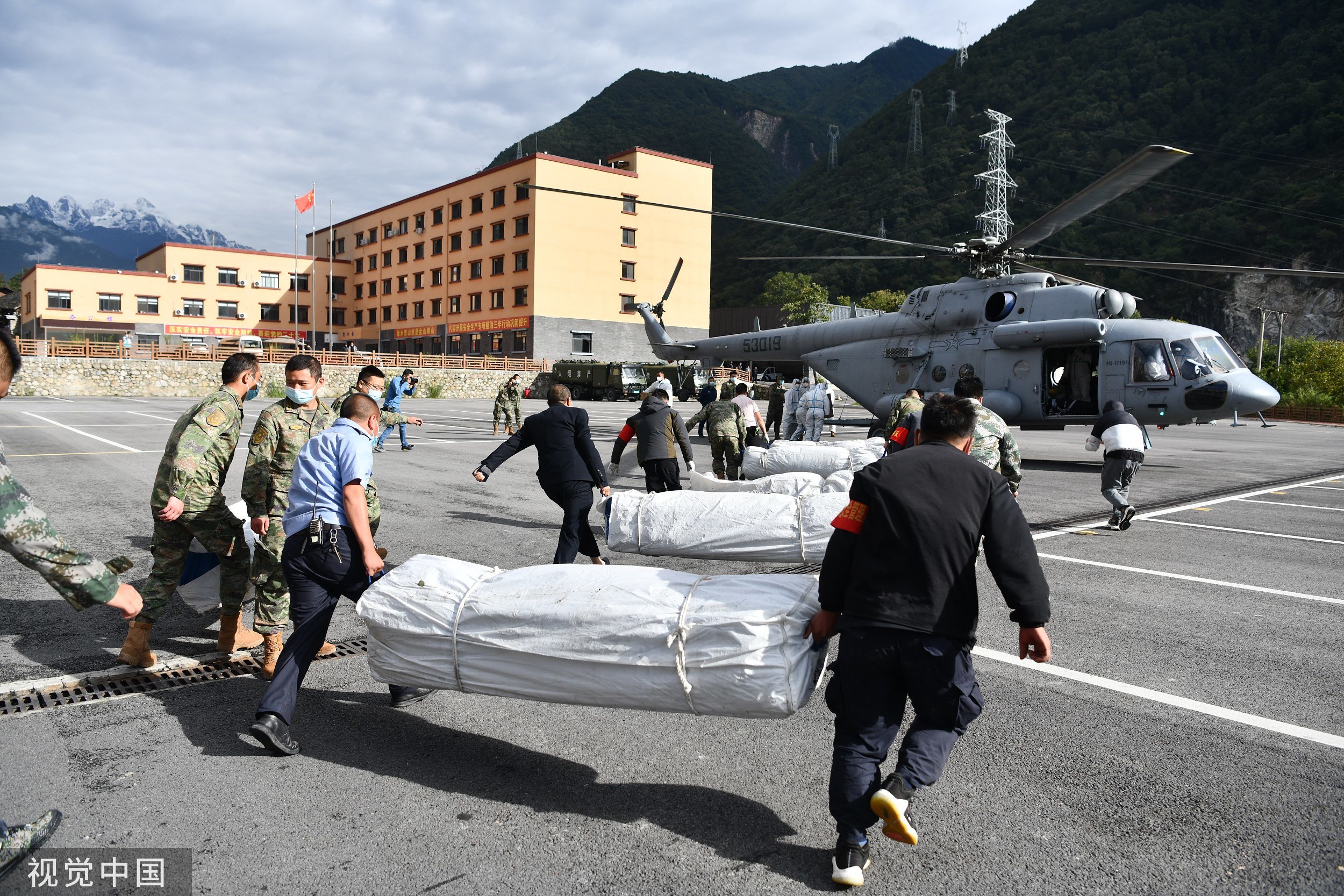 2022年9月10日,四川甘孜,泸定磨西镇,救援人员正在搬运帐篷等物资,随后通过直升机持续向海螺沟景区进行投放。