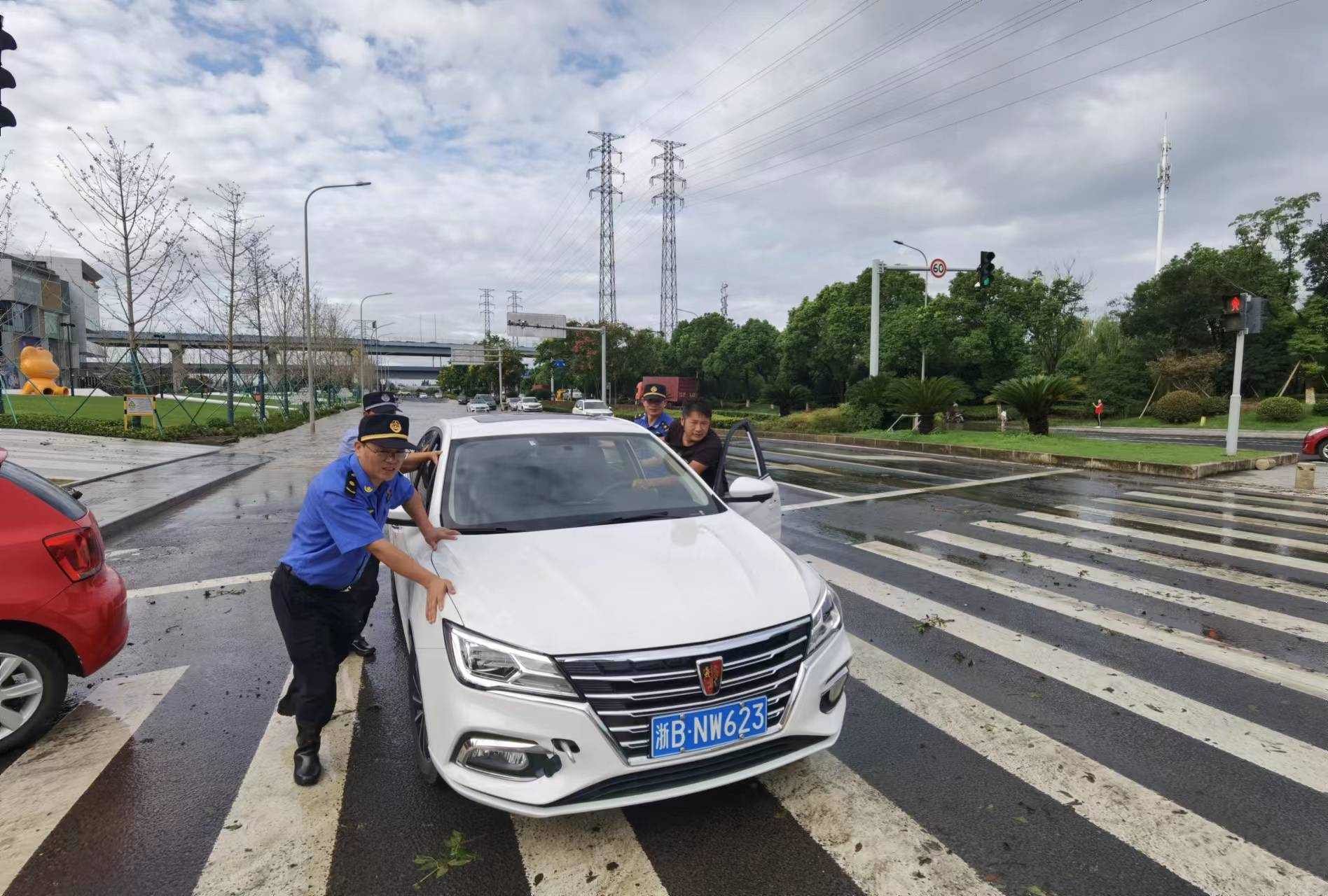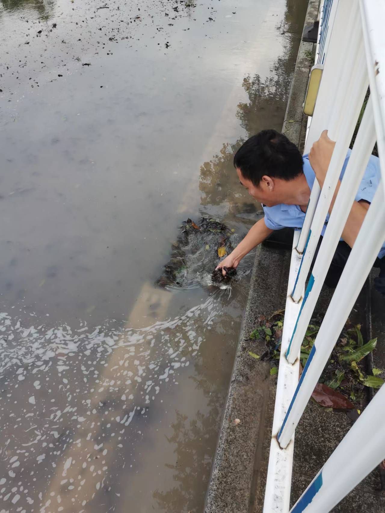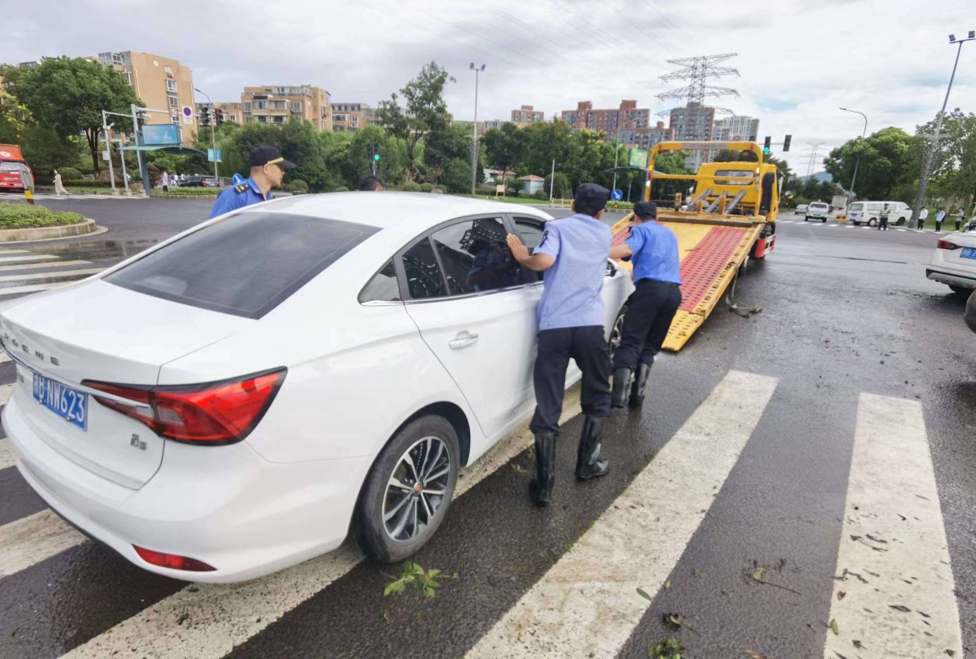 9月15日一早,风雨渐小,天空放晴,执法队员第一时间组织开展道路清障等市容市貌恢复工作。巡查过程中,执法队员发现不少窨井盖口被树叶堵塞,便徒手对淤积的落叶进行清理,对下水口井盖进行疏通;遇到险情已经排除的路段,执法队员将警示桩收回,确保过往车辆和行人正常通行;在前江宏图路商业体前,有涉水故障车停在马路中间,执法队员协力将故障车推上拖车……