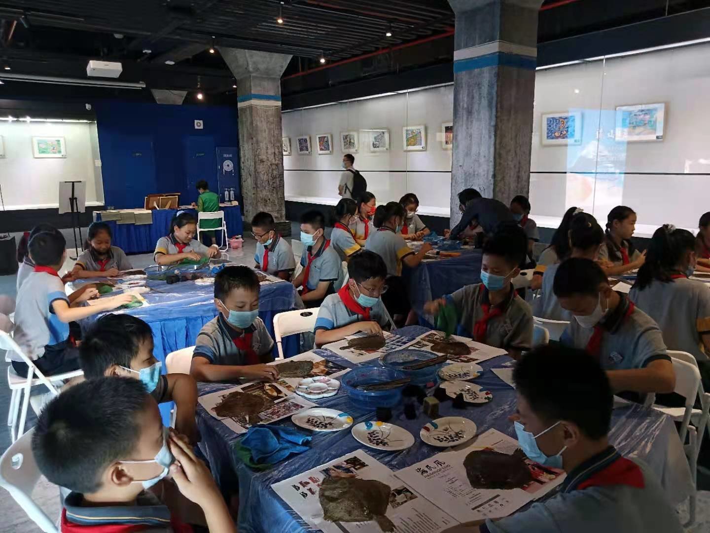 在艺术馆,以鱼为题材的非遗项目,得到传承和展示。鱼拓是流传民间的传统技法,传说每当逢年过节,渔民将捕获的新鲜的鱼涂上黑色的墨鱼汁,按压在红纸上,拓出鱼的形状,贴在门窗上,在今天艺术馆现场,小学生在传承人卢圣贵的辅导下,学习鱼拓制作。