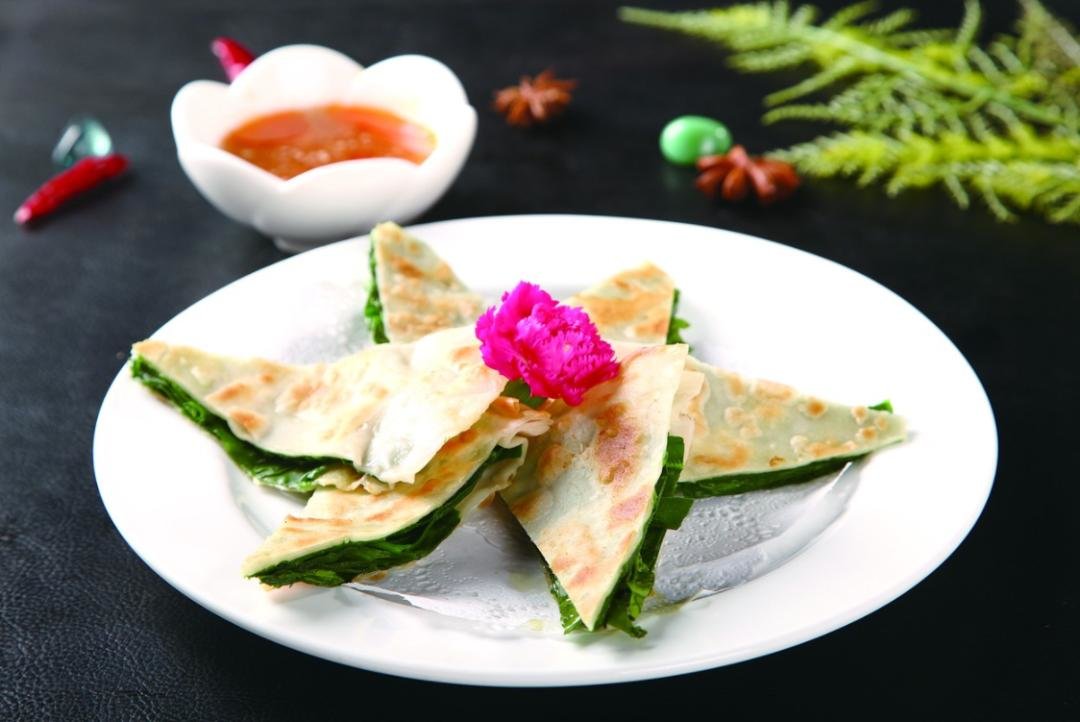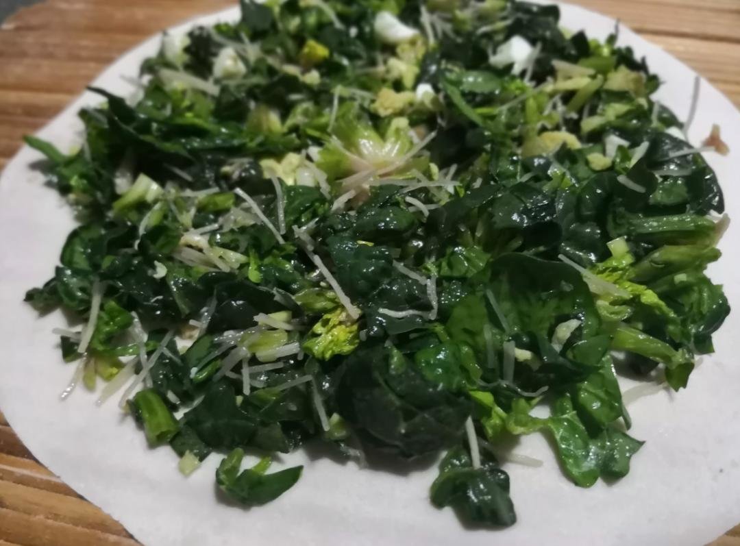 先在一张饼皮上铺好菠菜丨图虫创意