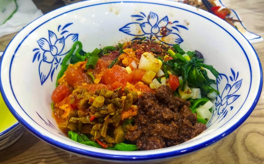 最广为人知的应该就是菠菜面了。以陕西的菠菜面为例,菠菜榨汁和面,擀出色泽碧绿、口感劲道的面条,捞进大碗,浇上肉臊子、西红柿鸡蛋、油泼辣子的“三合一”,狼吞虎咽咥(die)上两碗,再喝一碗煮菠菜面的绿色原汤,从里到外都觉得舒坦。