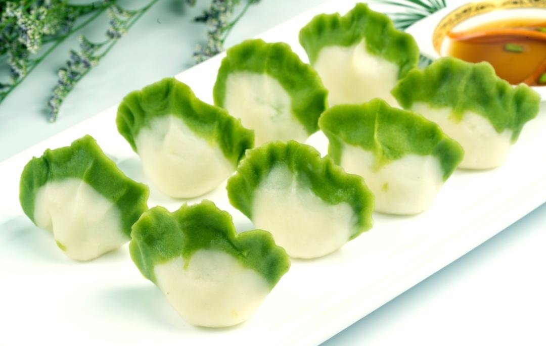用菠菜汁给饺子皮染色,做出的翡翠白玉饺子丨图虫创意