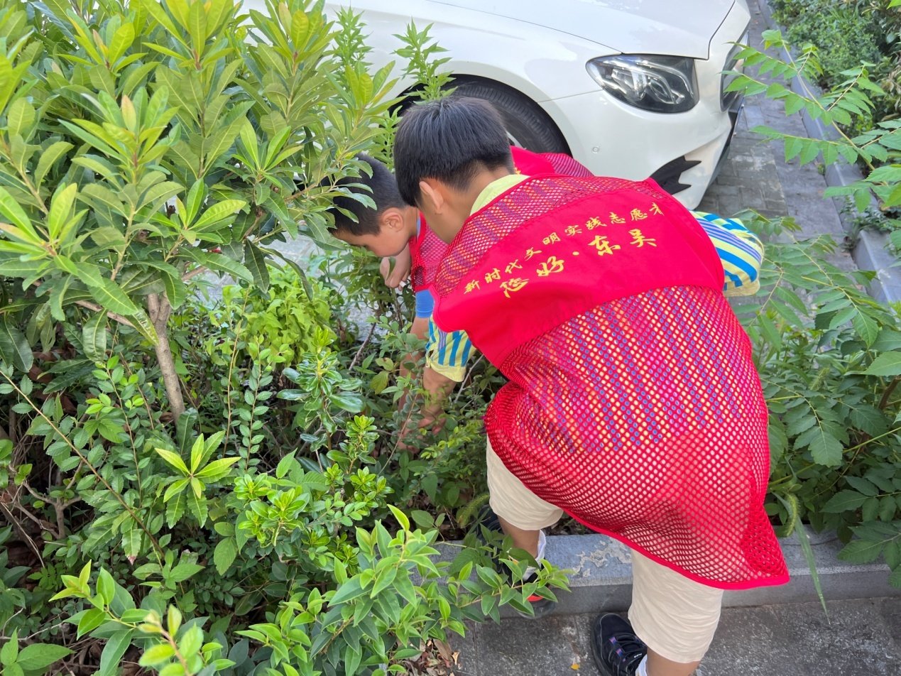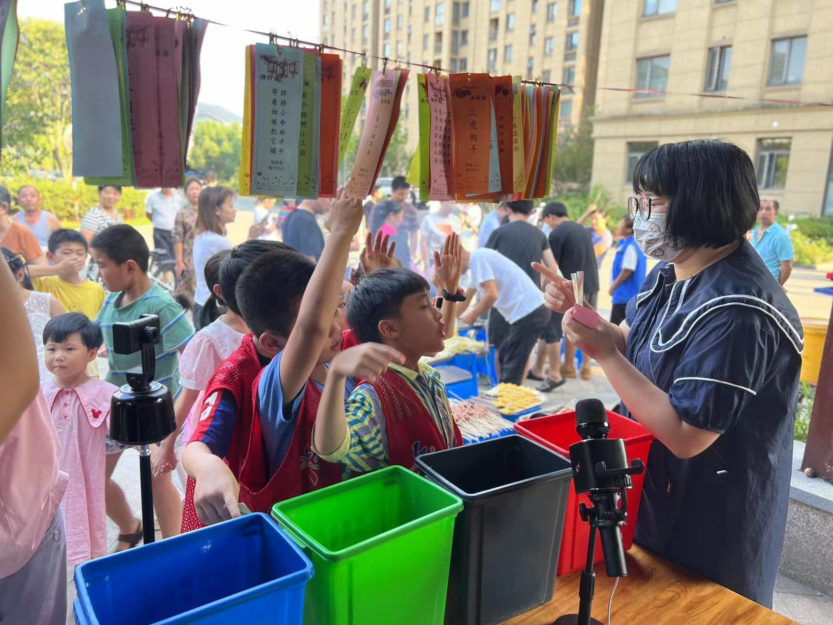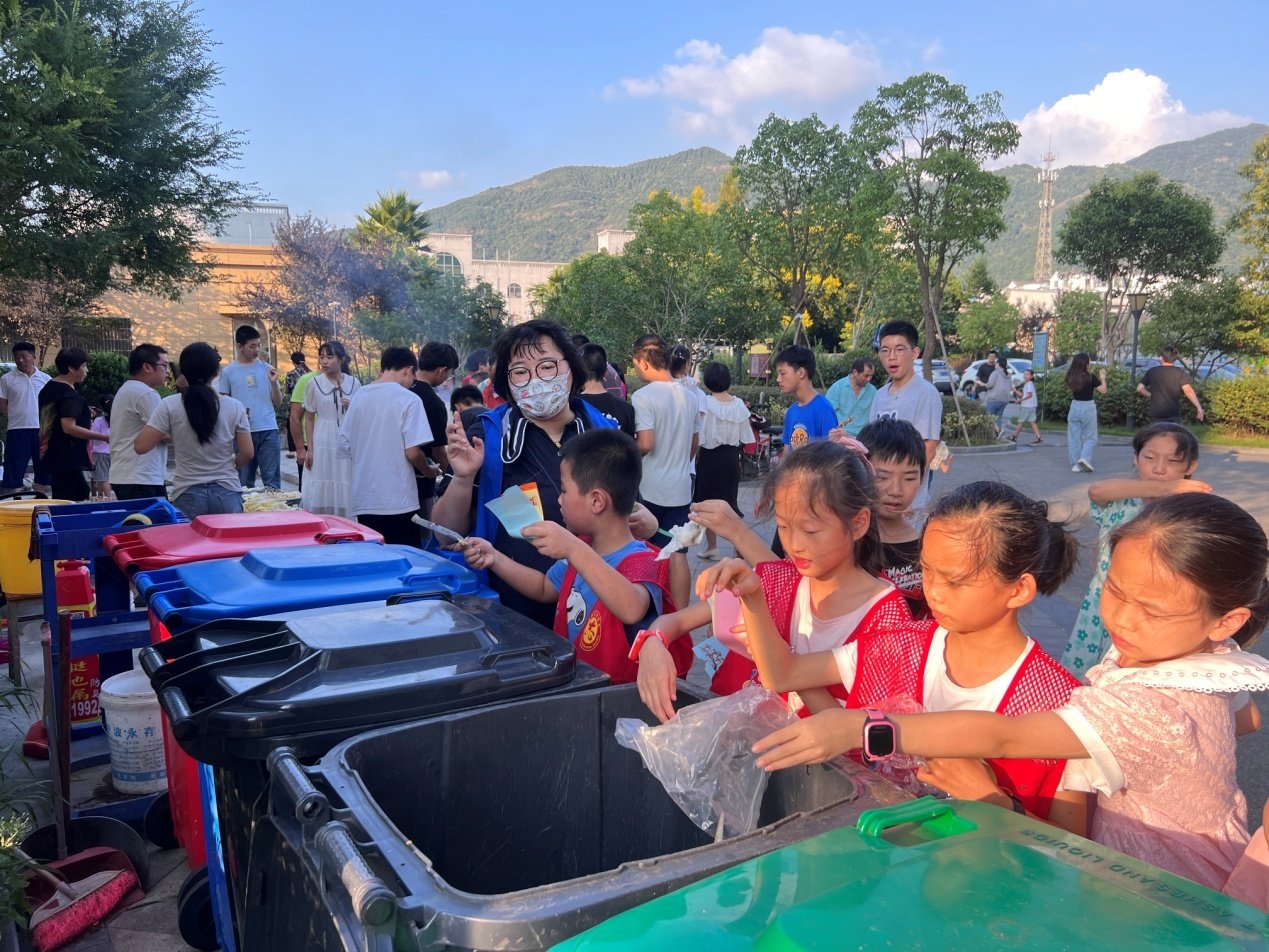 活动伊始,凤鸣社区工作人员向居民普及垃圾分类的相关知识,并邀请在场的小朋友们参与模拟垃圾分类的互动小游戏。小朋友们看着一张张标有垃圾物品名的卡片,开动小脑筋,将它们一一投放至相应的垃圾桶,投放正确就会得到一张礼券,兑换相应的小礼品。“中秋节我们要赏月吃月饼,那月饼礼盒丰富多样,不管是铁盒、木盒还是纸盒,这些都是可回收垃圾,但是吃剩的月饼是厨余垃圾哦,现在阿姨来考考你们,月饼盒里的干燥剂是什么垃圾呢?”面对工作人员的提问,小朋友们纷纷举手回答。模拟游戏结束,工作人员带着小朋友们进行“实战演练”。小朋友们在小区停车场、绿化中纷纷找起了垃圾,并将它们投放至正确的垃圾桶。