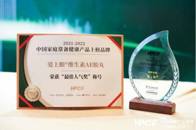 其中,由国药控股星鲨制药(厦门)有限公司生产的药品—爱上眼®维生素AE胶丸喜提“2021-2022中国家庭常备药上榜品牌”,并荣获“最佳人气奖”称号!