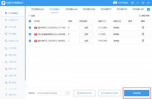 上传图片后,设置输出路径,接着点击【开始转换】按钮就可以将单页PDF转换为图片了。