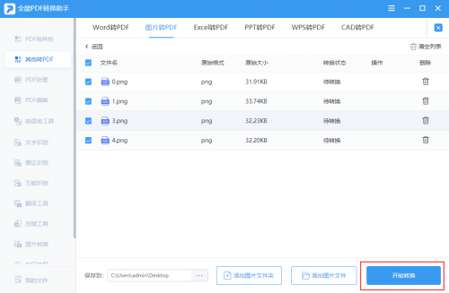 选择【图片转PDF】功能,上传裁剪好的图片,点击【开始转换】,就能将多张图片转换PDF文件。