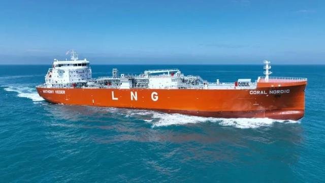 10月12日,中国船舶集团有限公司旗下江南造船(集团)有限责任公司为荷兰船东AnthonyVeder公司设计、建造的30000立方米液化天然气(LNG)运输船“CoralNordic”号在上海签字交付。图片来源:《中国船舶报》官方微信