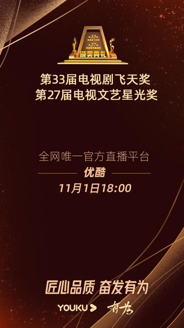 10月27日,第33届电视剧“飞天奖”、第27届电视文艺“星光奖”新闻发布会在京召开,会上公布,本届飞天奖共计46部作品入围,优酷联合出品的《觉醒年代》《巡回检察组》均在其中。此外,颁奖典礼将于11月1日,在北京首钢冰球馆举行,优酷作为官方指定平台,将连续两届独家承办红毯环节,并全网独家直播颁奖典礼。