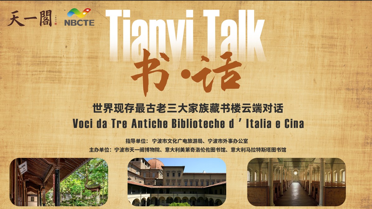 为积极响应中意文化旅游年,天一阁博物院策划举办“书·话--世界现存最古老三大家族藏书楼云端对话”,这是三家藏书楼确立在世界藏书史上的地位后近30年来的首次“聚首”。三家藏书楼的馆长将受邀出席活动,通过远程视频连线形式,就各自历史、现状与未来开展对话。三位馆长将分别讲述“一个故事”,介绍“一件藏品”,并开展“一次展望”,为公众打开一扇了解中意文化的窗口,也为中意双方进一步深化在文旅领域的交流与合作创造了新的机遇。