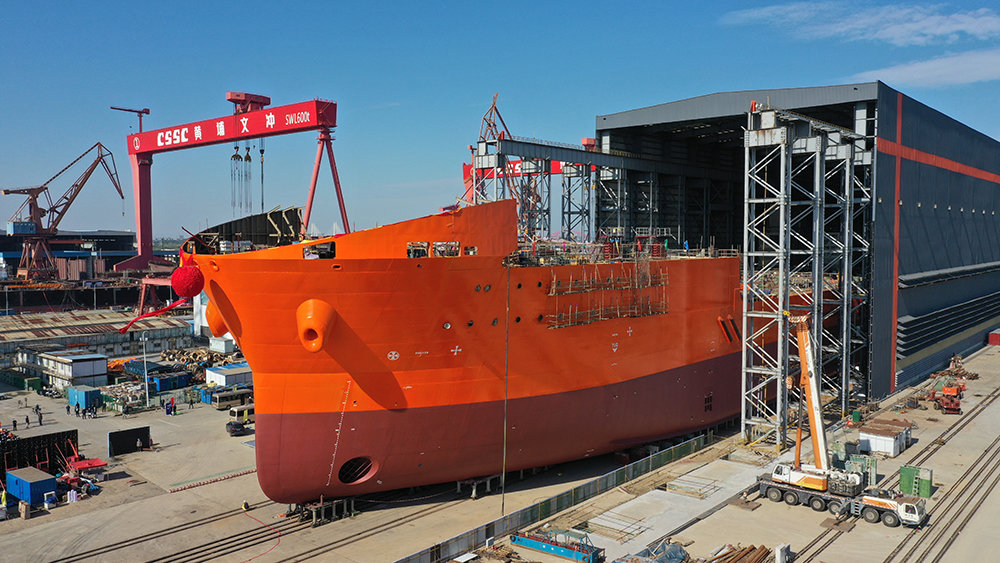 12月18日,由我国自主设计建造的首艘面向深海万米钻探的超深水科考船-大洋钻探船在广州市南沙区实现主船体贯通。自然资源部中国地质调查局 供图
