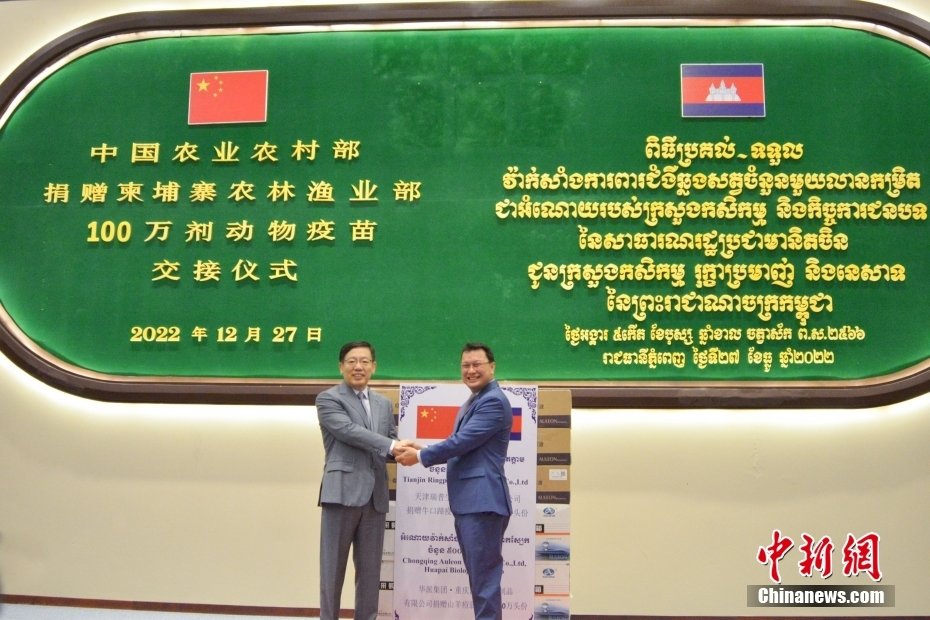 12月27日,中国农业农村部捐赠的100万剂动物疫苗交接仪式在金边举行。中国驻柬埔寨大使王文天、柬埔寨农林渔业部大臣邓迪那出席并致辞。 中新社发 余湘珺 摄