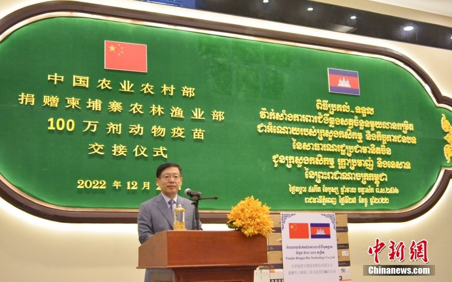 中新社金边12月27日电 (欧阳开宇 余湘珺)中国农业农村部捐赠的100万剂动物疫苗交接仪式27日在金边举行。中国驻柬埔寨大使王文天、柬埔寨农林渔业部大臣邓迪那出席并致辞。