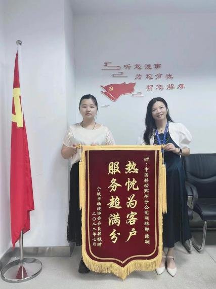 2022年7月19日,宁波市物流协会会员部负责人王女士来到宁波移动鄞州分公司,向网络部副经理熊斓送来了一面写着“热忱为客户、服务超满分”的锦旗。