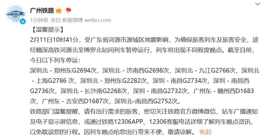 中新网2月11日电 中国铁路广州局集团有限公司官方微博11日发布提示称,2月11日10时41分,受广东省河源市源城区地震影响,为确保旅客列车及旅客安全,途经赣深高铁河源北至博罗北站间列车暂停运行,列车将出现不同程度晚点。截至目前,今日以下列车停运: