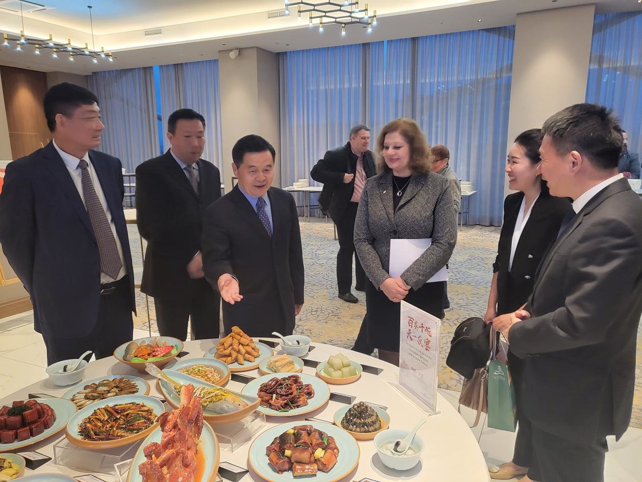 (董大使和莫德娃副部长饶有兴趣地品鉴宁波美食)