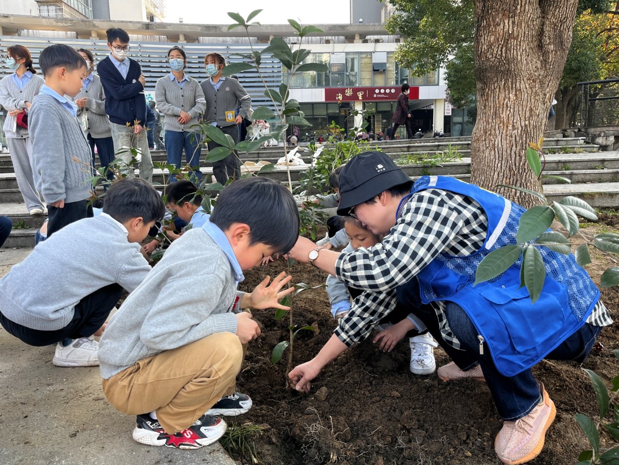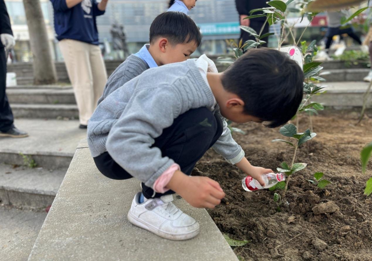 完成绘画后,小朋友们带着自己的小工具来到分配好的区域,在老师的带领下,给小区内的一片空地种上小树苗,垃圾分类工作人员巧妙地将厨余垃圾堆肥与花草种植养护有机结合在一起,并通过知识宣讲和现场实操的方式,让孩子们体验了一把有机堆肥和花草养护的乐趣。
