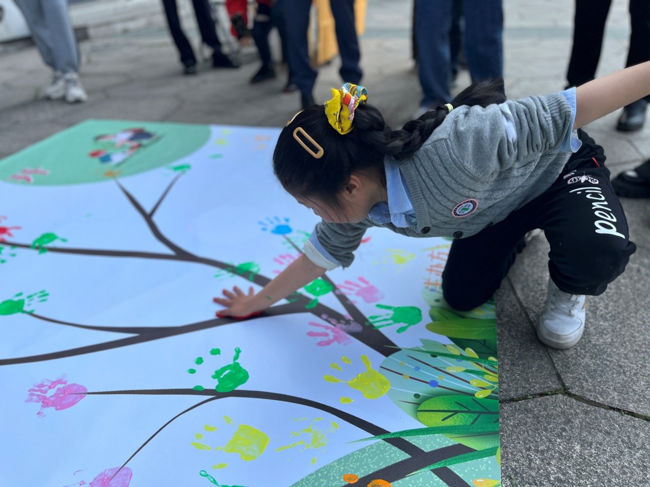 “王老师,快来看,我的树叶美不美?”来自新城第一幼儿园的小朋友汪亦航小脸上洋溢着快乐。孩子们用手轻轻地蘸取彩色颜料,然后画布上印下一片片独特的树叶,创造出一棵与众不同的手掌树。