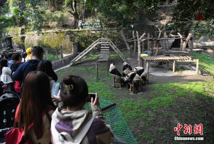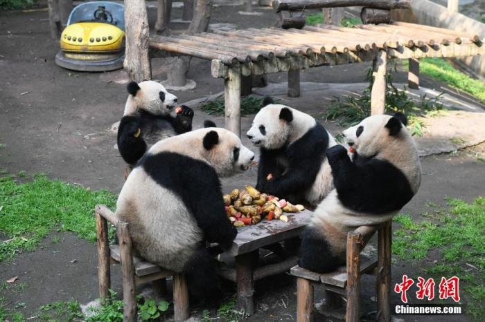 资料图:重庆动物园四只大熊猫“围炉煮茶”享用美食引围观。 周毅 摄