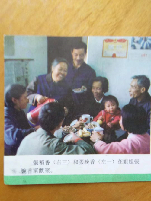 照片二,“张稻香(右三)和张晚香(左一)在姐姐张婉香家欢聚。”
