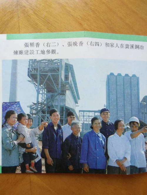 照片三,张稻香(右二)、张晚香(右四)和家人在贵溪铜冶炼厂建设工地参观。