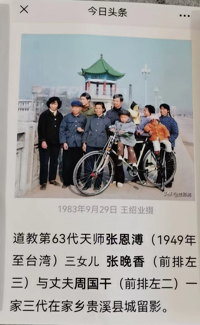 照片四,1983年时任全国政协副主席黄维(原国民党中将)回贵溪老家省亲,亲切地接见了张恩溥天师的女儿们。记者王绍业于1983年9月29日在贵溪大桥拍摄的张晚香全家福照片刊登在《今日头条》(大锦道长后排左一)。