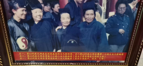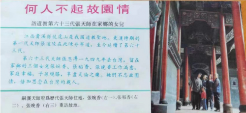 照片五,1996年,张恩溥天师在美国的女儿张怡香来国内寻亲认祖,在天师府与家乡的三个姐姐欢聚。张怡香(左一)张婉香(左二)张稻香(右二其子张金涛任天师府住持)张晚香(右一,其子是大锦道长)。