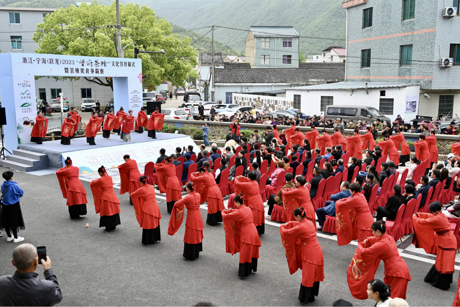 4月22日上午,宁海望府楼山下的望府村下枫槎村文化礼堂广场人声鼎沸,热闹非凡。浙江·宁海(跃龙)2023“望府茶飨”文化节开幕式暨茶飨美食争霸赛在这里火热开赛,吸引了不少当地村民踊跃参与。
