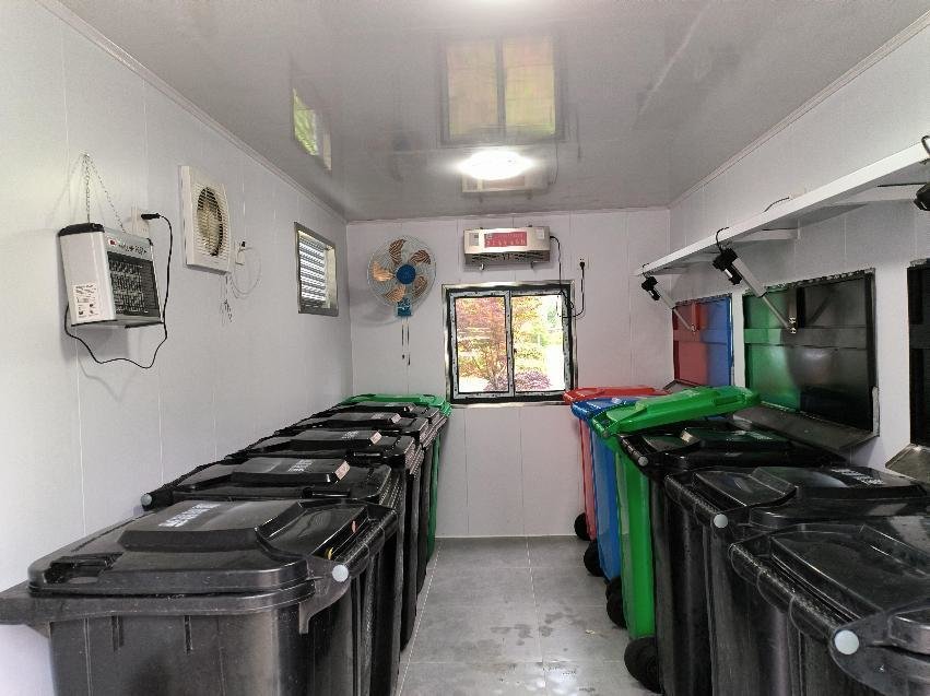 “换装”后垃圾房不仅外形“颜值”高,配有四分类垃圾桶,每一类桶下方都贴着投放指南,便于居民投放选择。垃圾房内部的硬件设施也让人眼前一亮,房内不仅有完善的通风、除臭、排水、杀菌系统,还专门设置了洗手台、诱杀蚊虫设施以及工具间。