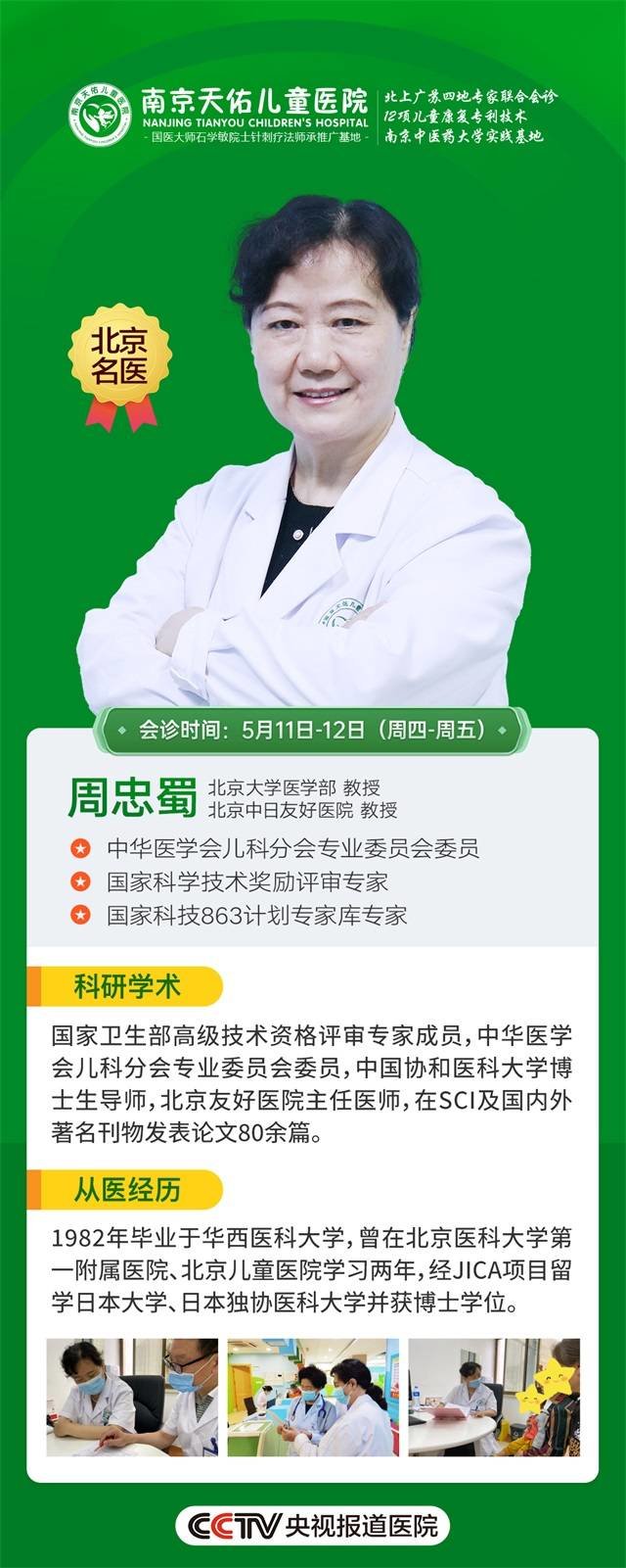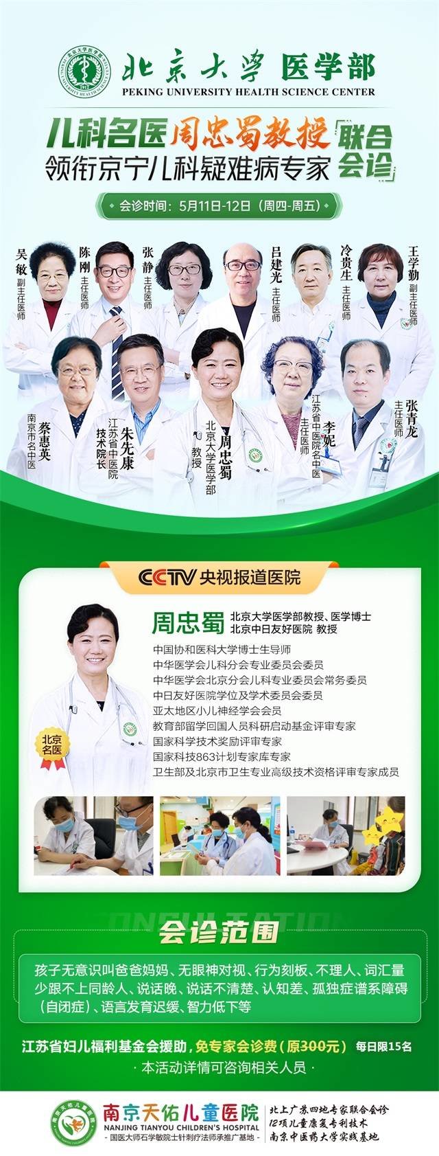 为了让更多的患儿得到更好的治疗,我院先后邀请了多位三甲儿科名医来院会诊,让很多生长发育患儿得到了专家们的精确诊疗,家长们都感到非常满意,但由于时间紧迫,还有大批患儿家长没有赶上会诊,最近多次来电询问。为满足大众看名医专家的迫切需求,5月11-12日,北京大学医学部儿科专家周忠蜀教授将在南京天佑儿童医院开展为期两天的儿童疑难慢病多学科会诊、专家联合查房及诊疗方案指导工作,有需要的家长可以开始预约啦!