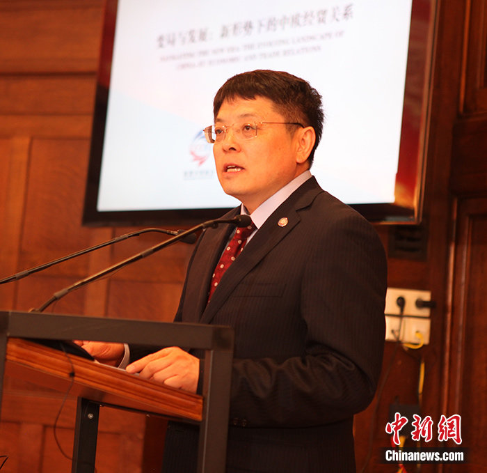 图为北京大学副校长、经济学院院长董志勇在论坛发表主旨演讲。 中新社记者 德永健 摄
