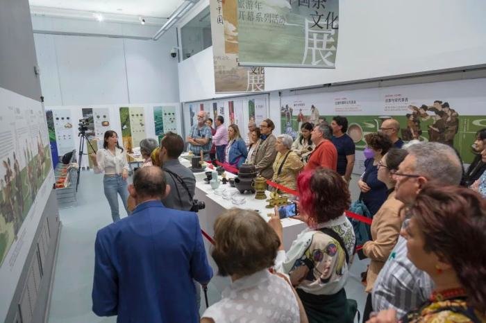 在马德里中国文化中心联袂西班牙茶文化协会举办的“茶和天下”·雅集活动上,别开生面的中国茶文化体验吸引了当地民众前来积极参与。来宾们首先参观了正在中心举办的“茶香器韵·品味中国—中国茶文化展”,通过聆听讲解并观摩展品,初步了解了中国茶文化的发展与变迁。