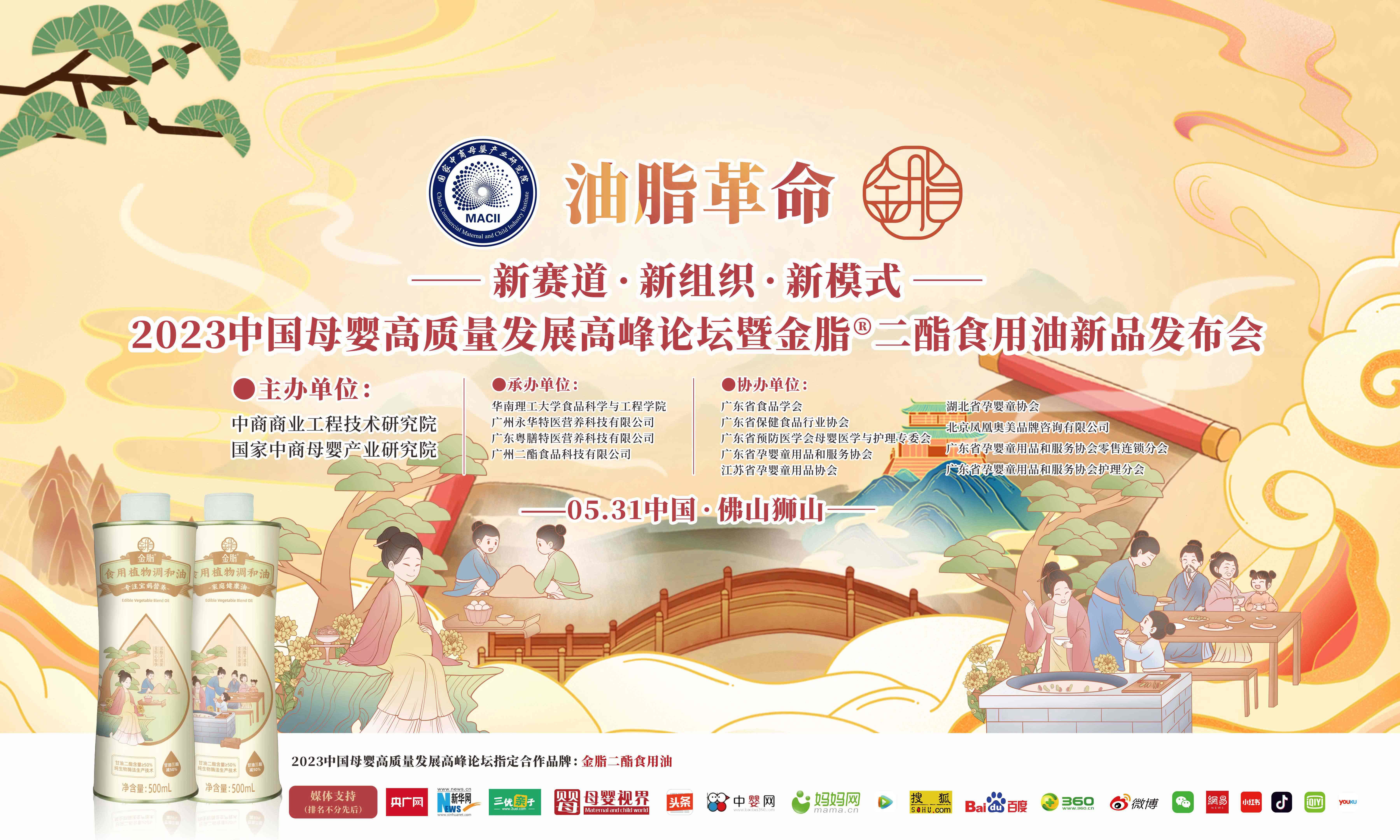 5月30-31日油脂革命——2023中国母婴高质量发展论坛暨金脂二酯食用油新品发布会,由中商商业工程技术研究院、国家中商母婴产业研究院主办,全国各大母婴商协会及相关母婴产业企业协办,华南理工大学食品科学与工程学院、广州永华特医营养科技有限公司、广东粤膳特医营养科技有限公司、广州二酯食品科技有限公司承办。届时广东、江苏、浙江、湖南、福建等全国多地母婴同行大咖以及业内权威专家与优秀企业将齐聚小镇狮山,颇似当年互联网行业的乌镇网络大会,大有母婴产业华山论剑之势!