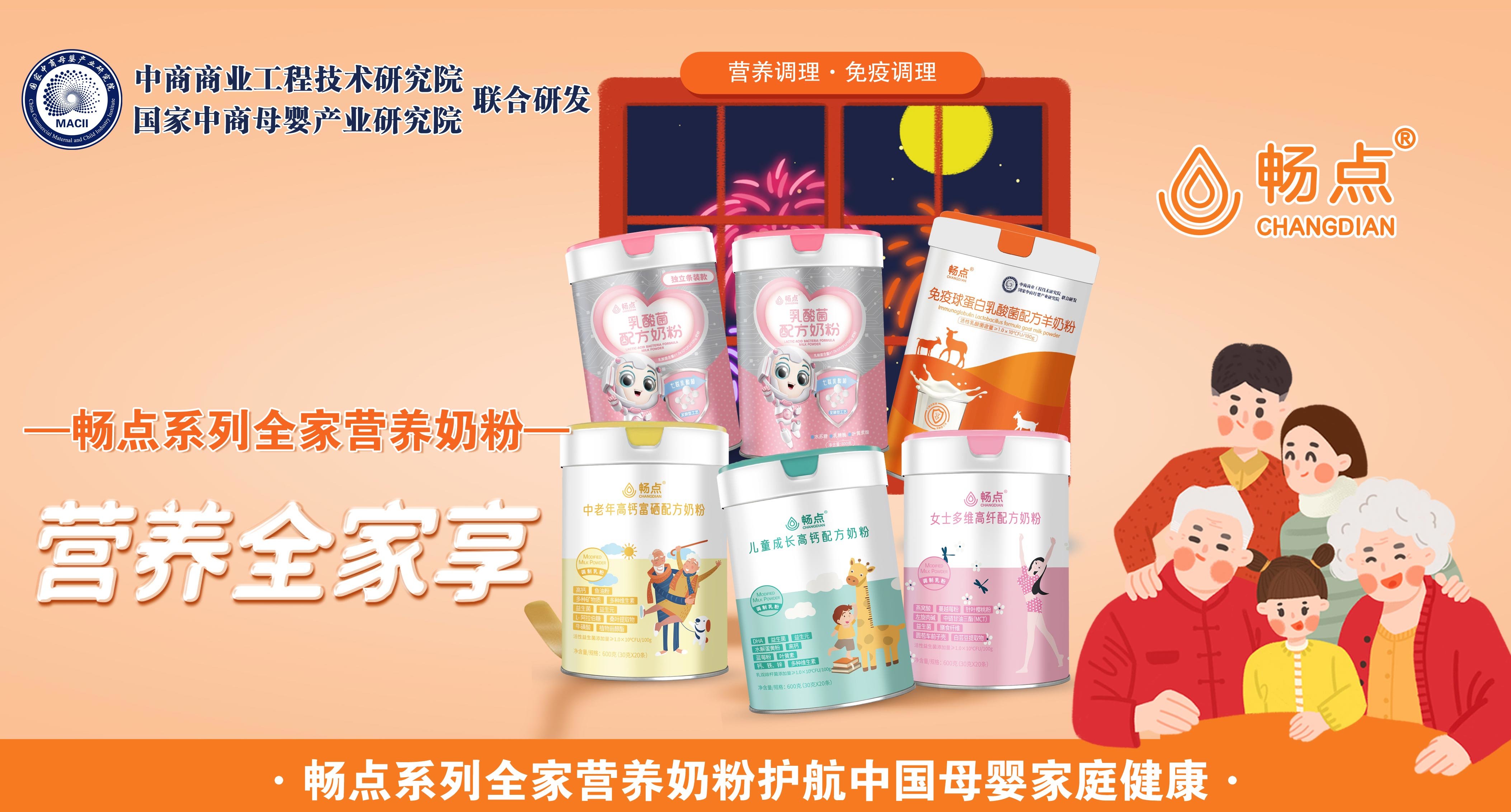 畅点系列全家营养奶粉呵护母婴家庭全家人健康,针对不同年龄段人群提供专属的配方营养奶粉。畅点系列全家营养奶粉目前有五大品类,分别是畅点免疫球乳酸菌配方羊奶粉、畅点发酵型乳酸菌奶粉、畅点儿童成长高钙配方奶粉、畅点女士多维高纤配方奶粉、中老年高钙富硒配方奶粉。