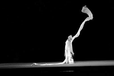 而钱玉莲的扮演者杨凯珍则借助水袖的百转千回摹写怨妇的悲剧,那两条水袖是女主心情的外化,被辜负的哀怨、命运不能自主的愁苦、誓死忠于爱情的决绝都在其中;水袖也是对江水生动的模拟,浅水区的荡漾与深水区的汹涌,中国戏曲中最神奇最美好的虚拟表演,让观众席里的人都体会到了深夜涉水的那份寒凉。尤其当她从生之留恋死之恐惧中挣脱,毅然赴死的刹那,一丈二的水袖“刷”地一下甩将出去,带着凌厉飞扬的力道,又如花朵般坠落飘零,天!