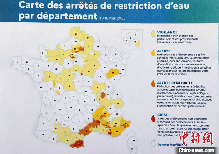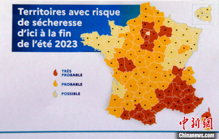 法国官方本周发表的一份最新报告显示,法国今年炎热干旱和水资源短缺问题可能比去年更加严重。报告公布的地图标明了需要限制用水的省份。 中新社记者 李洋 摄