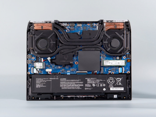 这款游戏本采用了双风扇散热设计,配有5根扁平热管,出风口多达四个。这款机型标配了单根16GB DDR5-4800内存,同时还预留有一根DDR5内存插槽。对于性能有更高追求的玩家们来说,可以自行继续加装一根DDR5内存,组建双通道模式。PCIe4.0固态硬盘为SSSTC出品的,也就是建兴,目前在铠侠旗下,硬盘容量为512GB。同时,这款游戏本还预留了一处M.2固态硬盘安装位,标准M.2 2280尺寸,同样支持PCIe4.0 CPU直连,玩家可以自行扩展硬盘容量。无线网卡为Intel Wi-Fi 6 AX201,支持Wi-Fi 6。新普科技的锂电池,电池容量为64.31Wh,能够为这款游戏本提供不错的续航能力。
