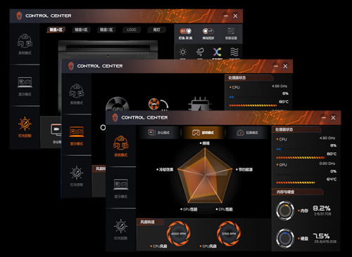 CONTROL CENTER是系统里标配的控制软件,玩家可以利用它对电脑的运行模式、键盘灯效、RGB氛围灯效进行设置,打造自己理想的电脑运行效果。在“系统模式”界面下,预置了3种系统运行模式,包括“狂暴模式”、“游戏模式”以及“办公模式”。其中“狂暴模式”是这款游戏本的至高性能模式。