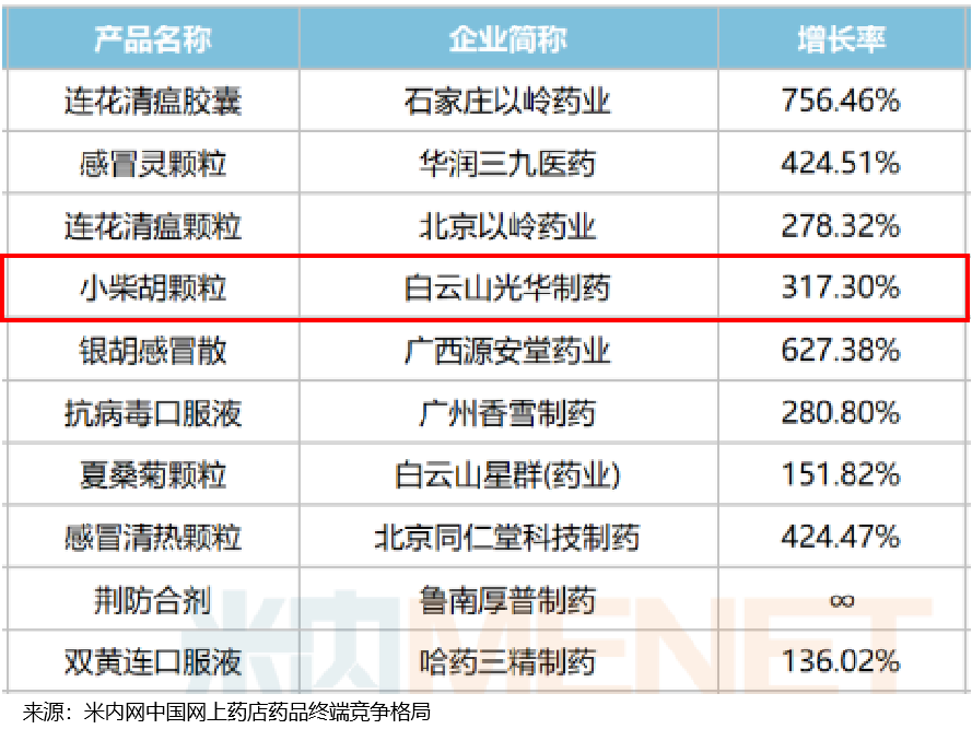 而在米内网所公布2022年中国网上药店终端感冒中成药TOP20品牌中,广药集团旗下白云山光华制药所生产的白云山小柴胡颗粒脱颖而出,增长率达到317.30%。凭借在市场上的卓越表现,白云山小柴胡颗粒成为品类领先品牌。