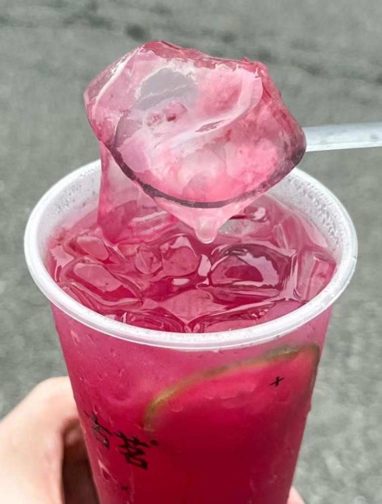 新鲜现剥的葡萄果肉酸甜浓郁,口口爆汁,点睛之笔的香水柠檬切片为饮品增添了柠檬果香,清爽加倍,茉莉花茶和清凉冻的加持为这杯葡萄爆爆柠增添了Q弹软韧的口感,畅快过瘾,一杯入夏!