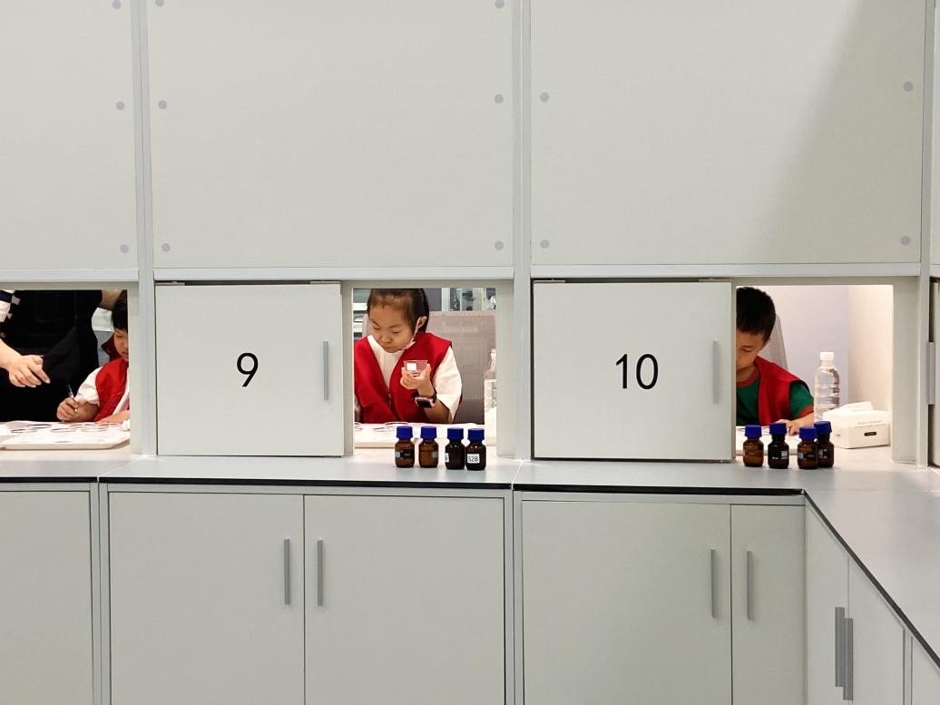 随后,老爸评测质量工程师郭春华老师和抽检审核工程师张子睿老师分别向小记者们讲解了鼻子和舌头感受嗅觉和味觉的工作原理,大家还进入了感官实验室进行了一次嗅觉、味觉测试体验,通过嗅觉对不同浓度的香草水进行排序,通过味觉尝出酸甜咸鲜等不同味道并进行一一对应。据悉,感官实验室是老爸评测团队先后拜访众多专家学者,投入百万元资金,耗时半年搭建而成。孩子们凭借灵敏的嗅觉和味觉准确无误的完成了测试体验,都取得了不俗的成绩。为了激发孩子们的兴趣,鼓舞他们对感官体验的探索,老爸评测还特别颁发了徽章和体验证书。