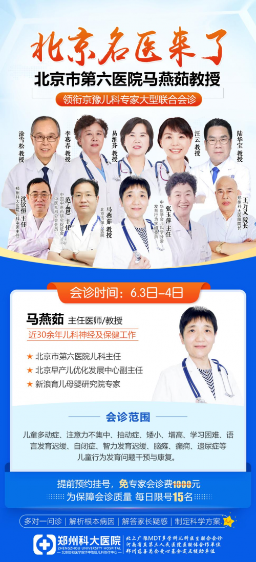 为了帮助这些特殊疾病儿童不出远门、在家门口就能享受到北京名医治疗,6月3-4日,郑州科大医院将特邀北京市第六医院马燕茹教授来院会诊,为患儿排忧解难,让每一位来院患者都能享受到个人专属治疗方案。