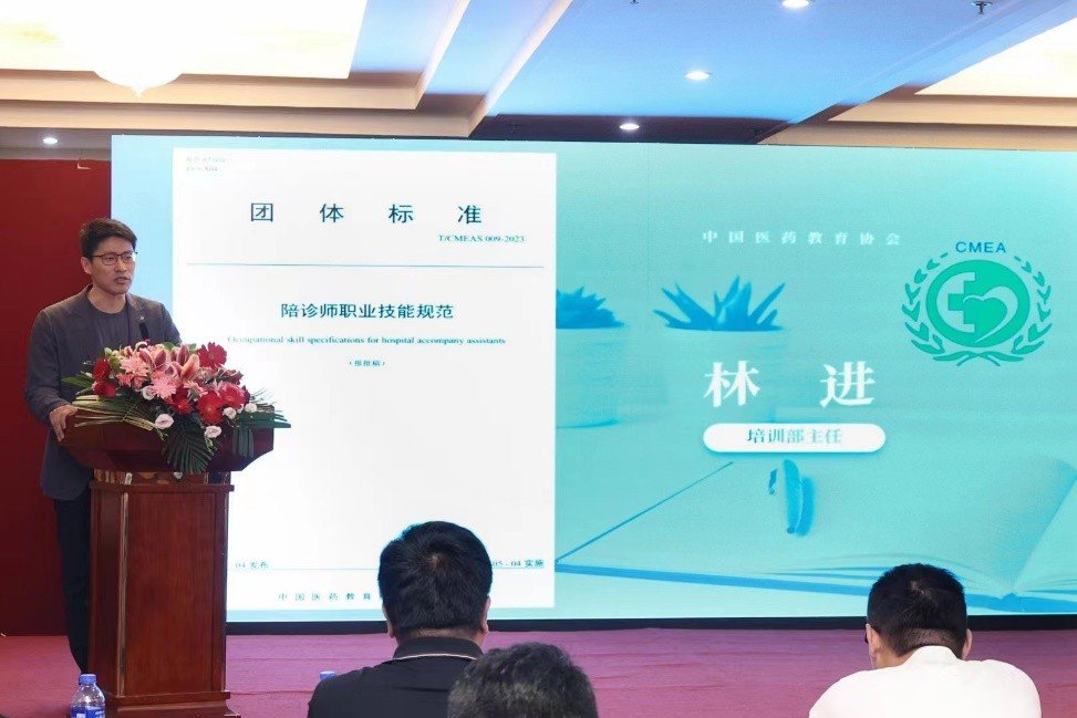 发布会以庄重的仪式拉开帷幕,核心议程包括多个重要环节。中国医药教育协会领导首先从协会的角度,介绍了国内首个陪诊师职业技能规范团体标准(标准编号:T/CMEAS009-2023,以下简称“陪诊师职业标准”)的背景和制定目的。他强调,陪诊师职业标准的出台旨在规范陪诊师的职业行为和技能要求,提高陪诊服务的质量和水平,保障患者的安全和权益。陪诊师职业标准全面覆盖了陪诊师的资质要求、职责和行为准则,以及专业技能和沟通能力等方面的要求,确保陪诊师具备必要的专业素养和服务能力。